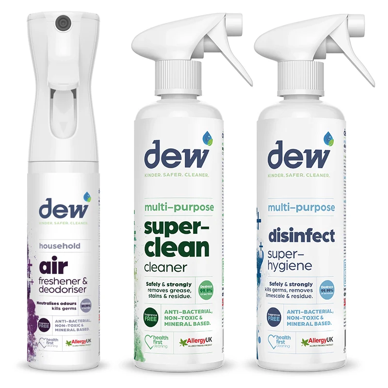 Embrace a cleaner, fresher home with the Dew SuperHygiene & Air Deodoriser Starter Pack. This trio is your ultimate ally against dirt, germs and odours, helping to ensure your living spaces are not just clean but hygienically fresh. Whether you’re looking to banish kitchen grease, sanitise surfaces or neutralise odours, this pack has you covered. With our Fragrance-Free, you can tailor your cleaning experience to suit your senses.